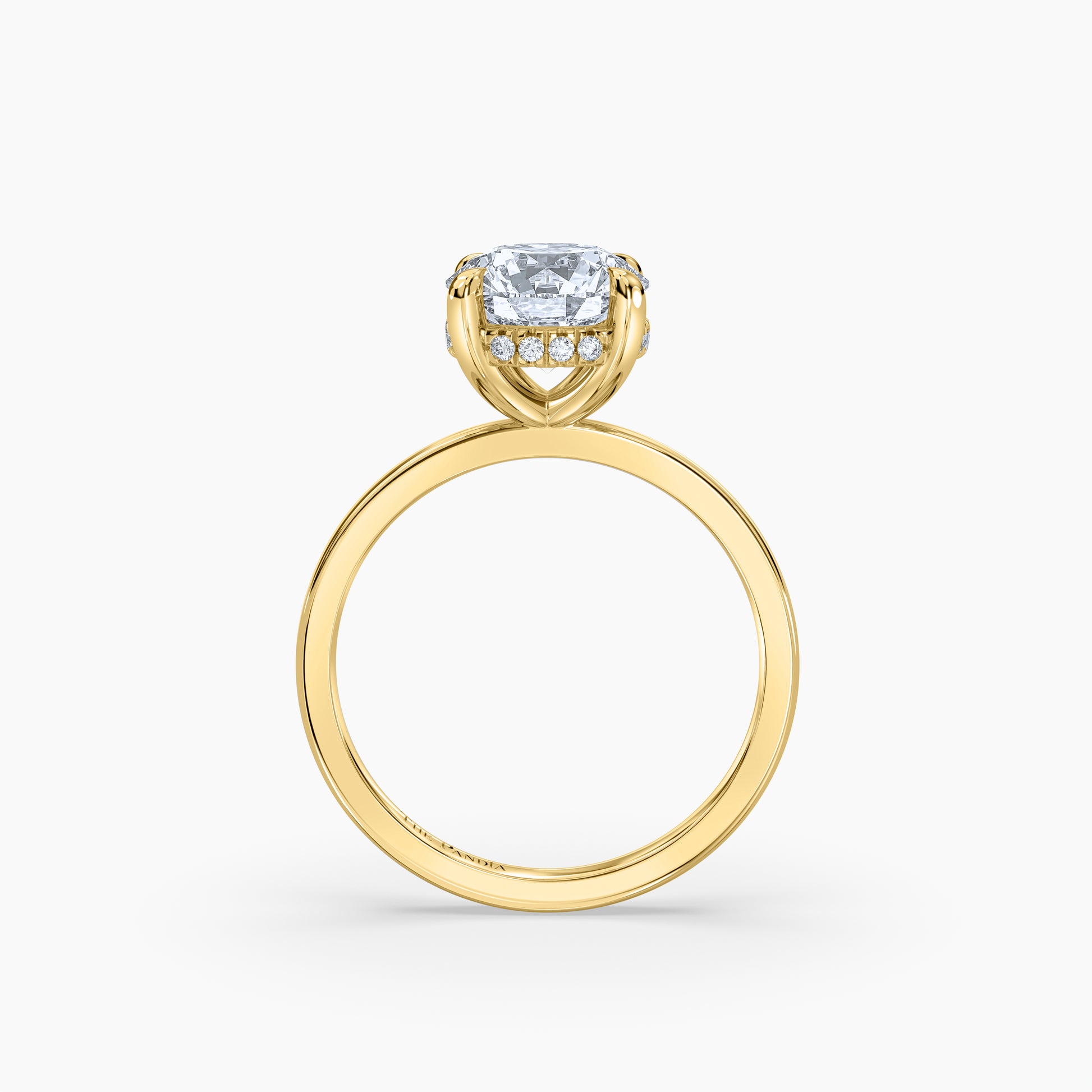 The Hidden Halo Ring features a lab-grown diamond, available in 1, 2, and 3 carat options, all set in an 18k gold and platinum band. The unique secret halo design incorporates small pavé-set diamonds around the base of the center stone, enhancing its brilliance while maintaining a sleek and elegant profile. The ring is designed with a four-prong setting to securely hold the center diamond. Type: Lab-grown diamond Color Grading: D Clarity: VVS2 Metal: 18k Yellow Gold Cut: Round Setting: Secret halo with pavé diamonds