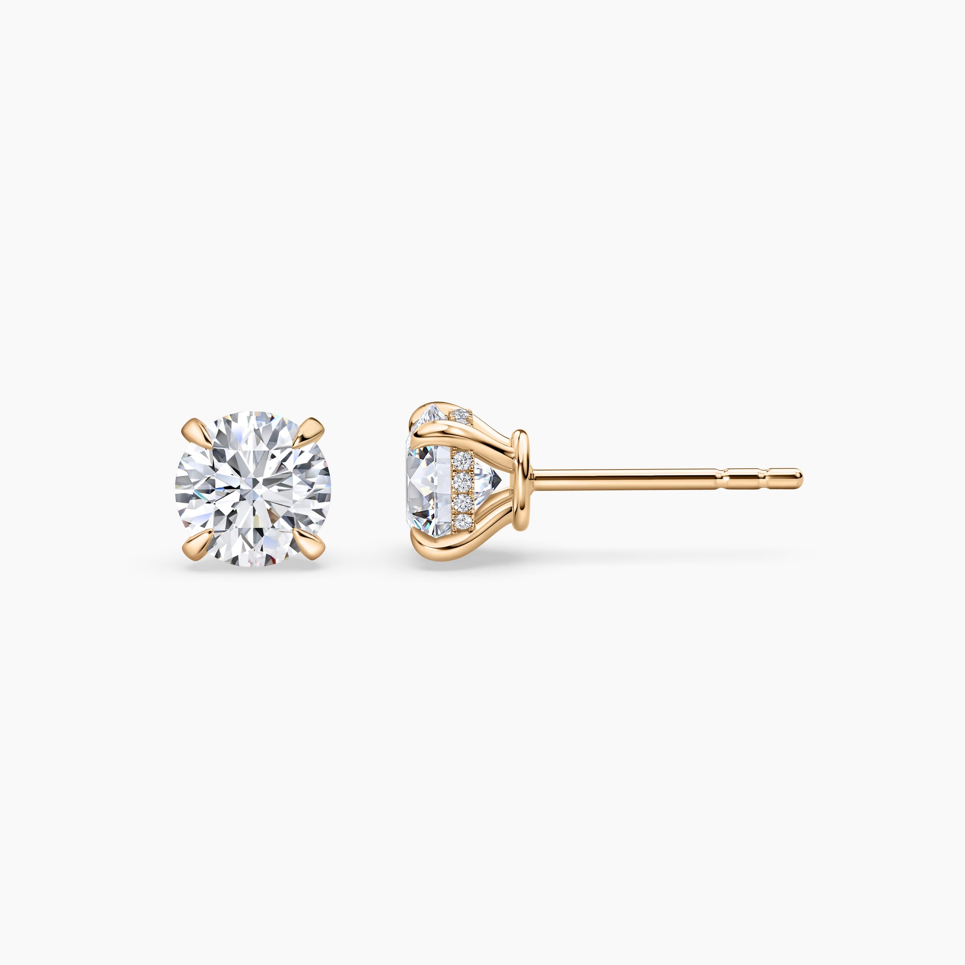 These classic stud earrings feature stunning round brilliant lab-grown diamonds at the center of each earring, available in 0.25, 0.5, and 1 carat options. Each center diamond, graded D-F color and VS1+ clarity, is held securely in a four-prong basket setting. Surrounding each center stone are smaller pavé-set diamonds, adding extra sparkle and enhancing the brilliance of the central diamonds. The earrings are crafted from 18k yellow gold, providing a timeless and luxurious look.